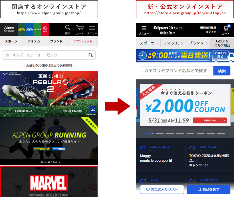 今後は、Alpen Group Online Store(新・公式オンラインストア)(https://store.alpen-group.jp/top/CSfTop.jsp)をご利用いただけますと幸いです。