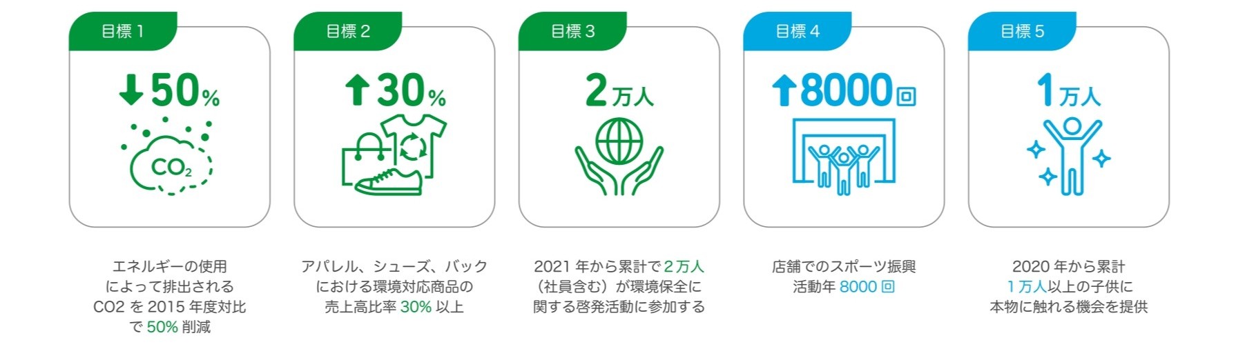 アルペンの考えるサステイナビリティとは「その時代に生きるすべての人がスポーツをもっと身近に楽しむことのできる社会」を実現することです。現代社会は、気候変動や環境汚染、少子化などの多くの課題に直面しており、スポーツを楽しむ環境が失われつつあります。当社は小さなスキー用品専門店からスタートして現在に至るまで、スポーツを愛する人々によって支えられてきました。スポーツをするために必要な自然環境を守ること、スポーツを楽しむ愛好家を育むことは当社の責任であり使命です。その使命を果たすため2020年4月に、次世代につなぐ2つのプロジェクトと2025年までに達成を目指す10の目標を策定しました。目標策定以降様々な取り組みを進め、一部項目において目標を達成したため、2022年7月に目標を刷新し、新たな5つのサステイナビリティ目標へとアップデートしました。新目標を2027年までに達成することを目指し取り組んでまいります。