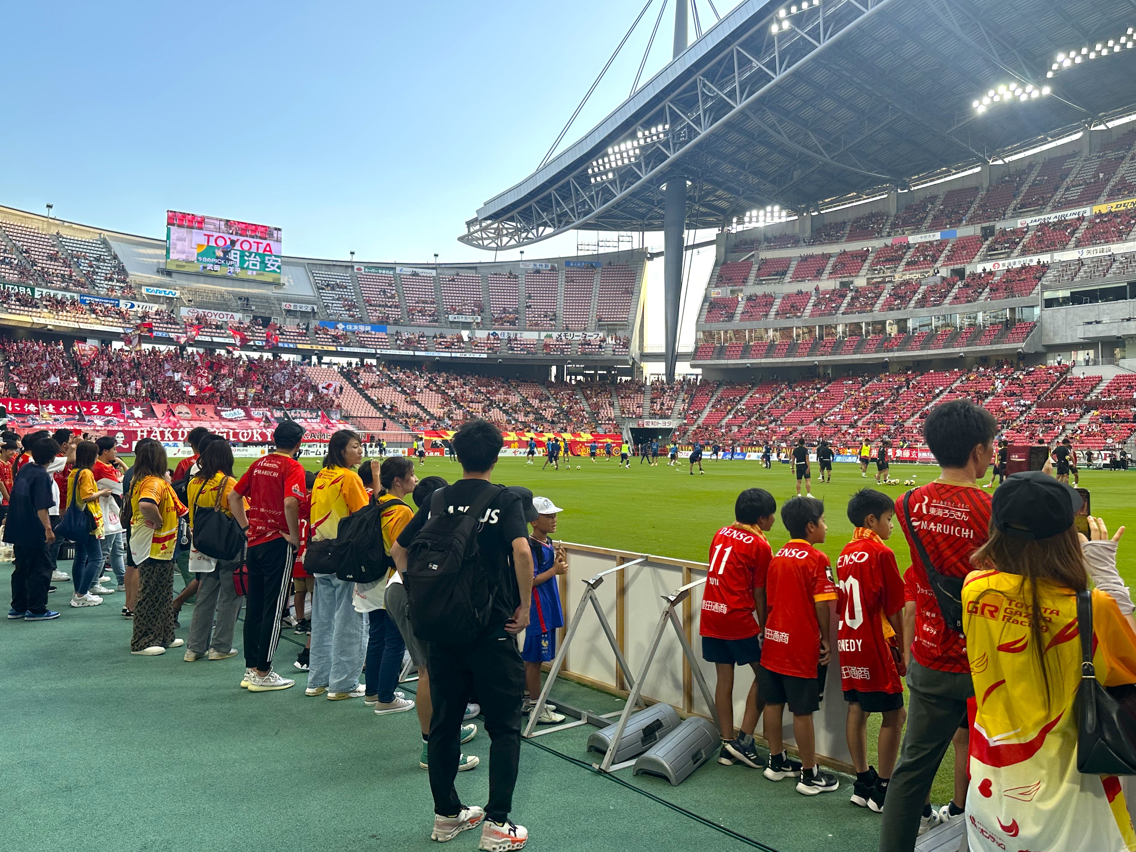 9月27日(土)、豊田スタジアムにて、プロサッカーチーム「名古屋グランパス」のホームゲームにてピッチサイド見学を実施しました。本イベントはサッカーを通じて子どもたちに夢を届ける「ドリームキッズプロジェクト」の一環として企画されたものです。当日は子ども15名と大人15名の計30名が参加。間近で見るプロ選手のプレーに目を輝かせたり、カメラを構えて夢中で撮影したりする子どもたちの姿や、お子さま以上に興奮してプレーに見入る大人の姿など、さまざまな様子が見られました。ピッチサイド見学のあとは、鹿島アントラーズとの試合を観戦。結果は敗戦でしたが、プロ選手の迫力あるプレーを間近で体感した子どもたちの顔には満面の笑みが広がっていました。