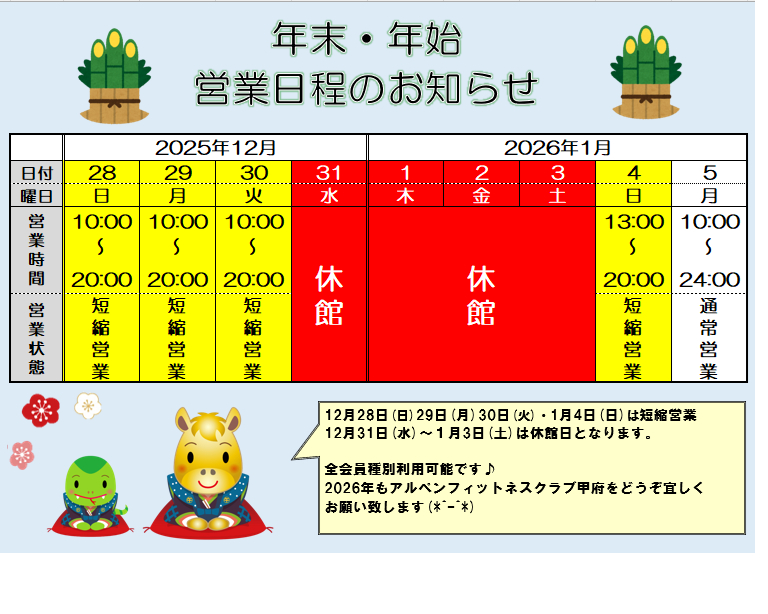 1月4日(日) 短縮営業 ※13:00~20:00 全会員種別利用可