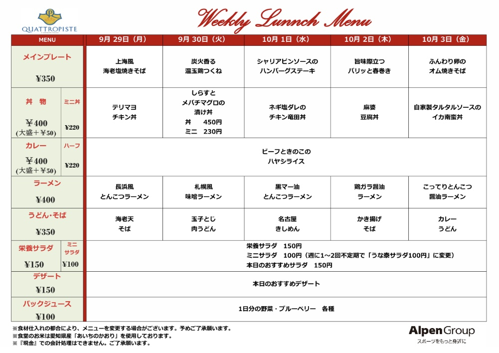 今週の食堂メニューです。