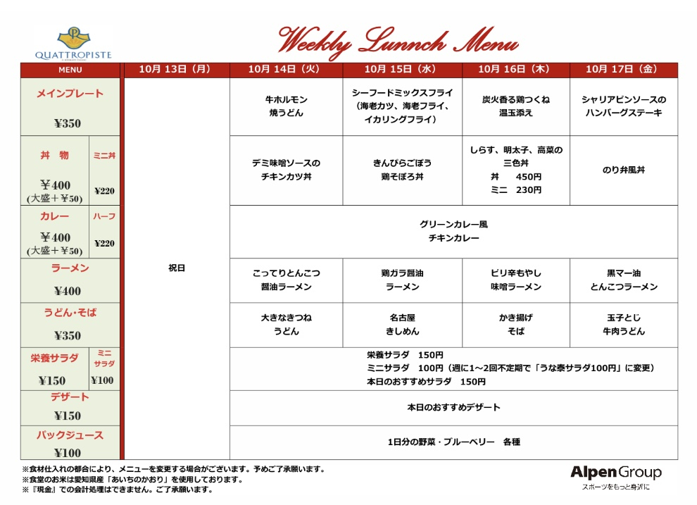 今週の食堂メニューです。