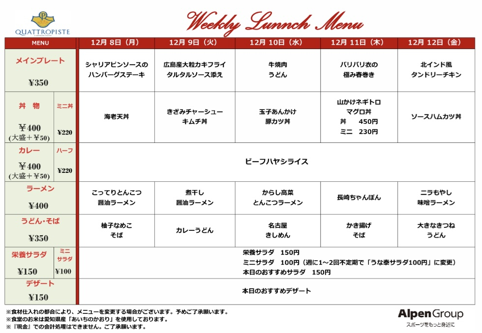 今週の食堂メニューです。