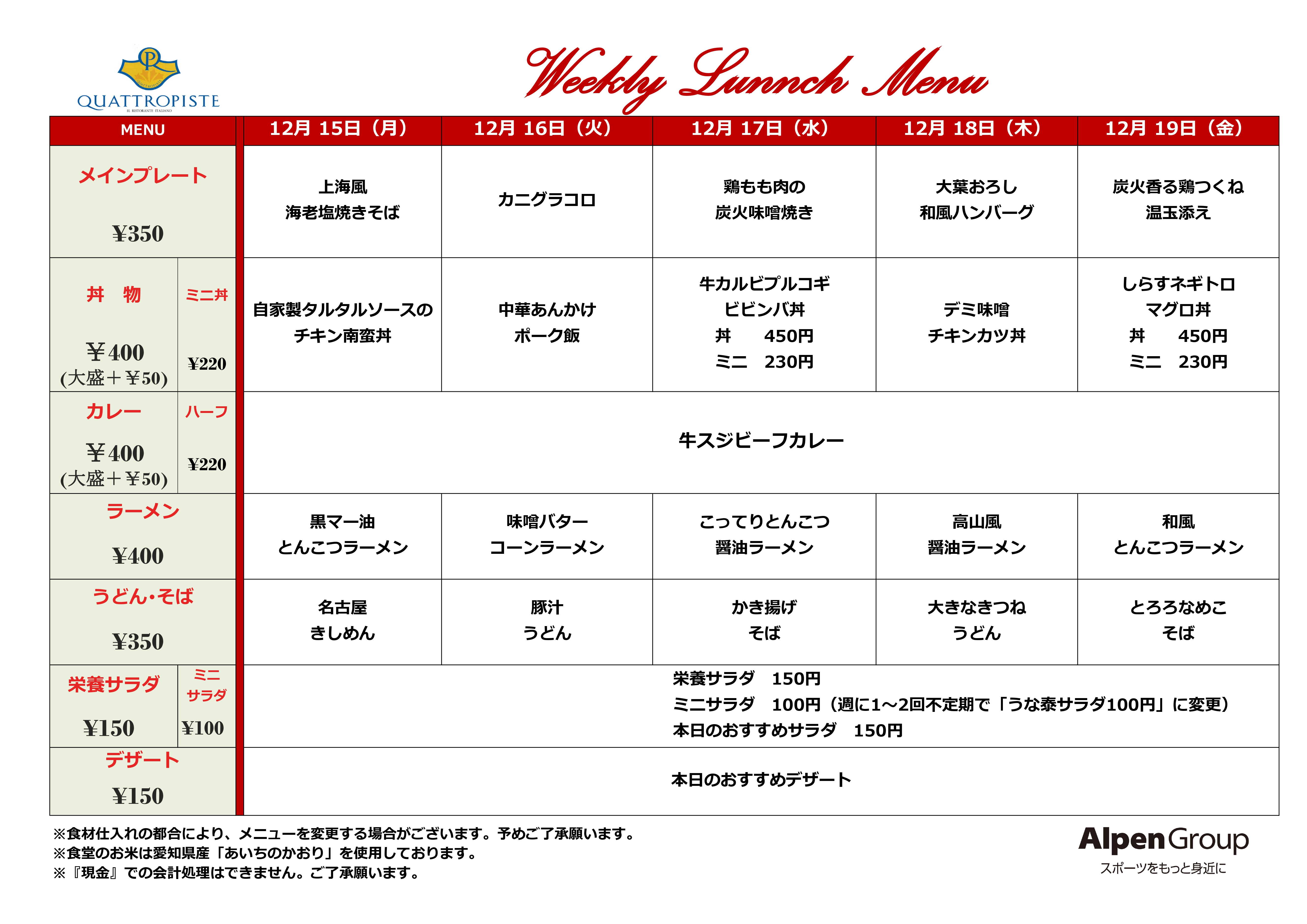 今週の食堂メニューです。