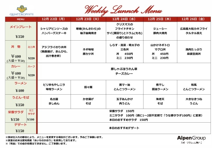 今週の食堂メニューです。