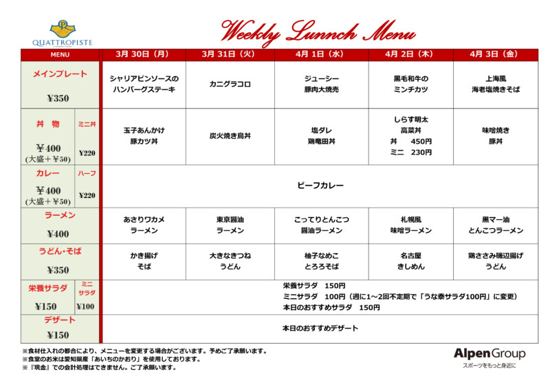 今週の食堂メニューです。