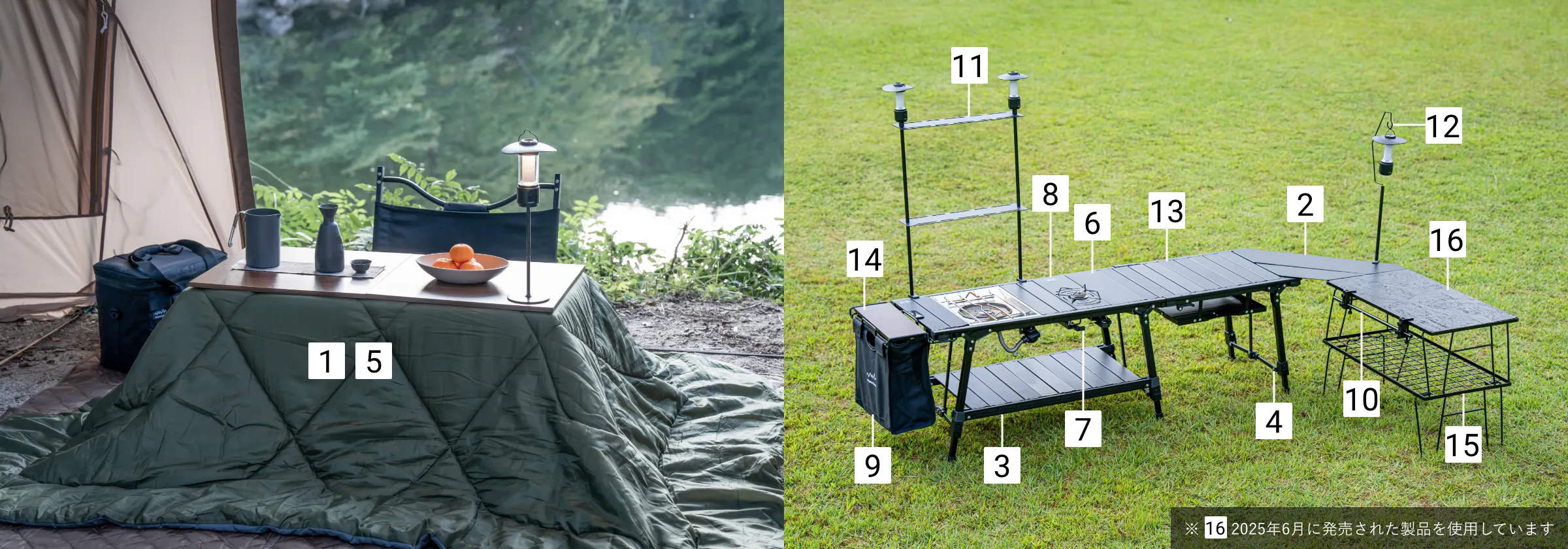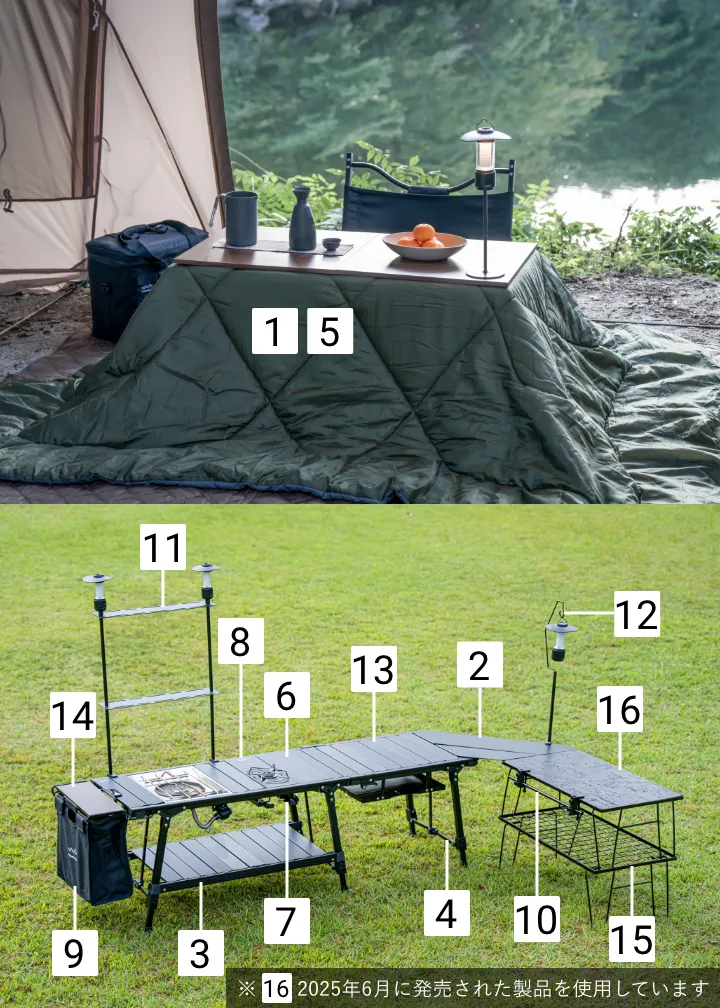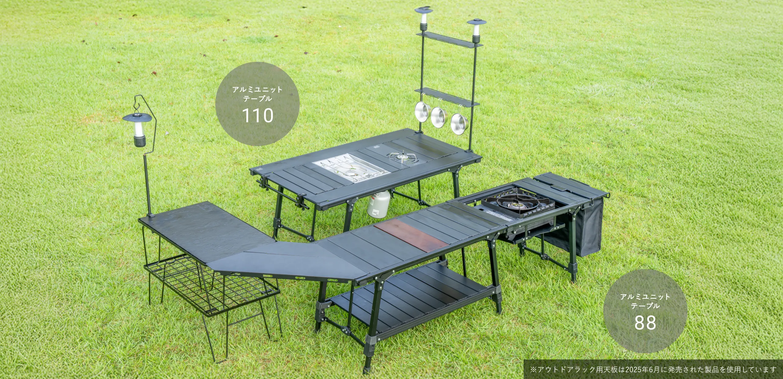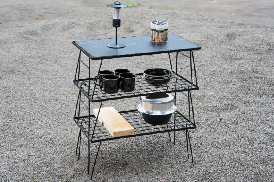 購入するラックは1段でも2段でも、マルチに設置可能。ポールの先端には1/4インチのキャップネジがついており、市販のLEDランタンを取り付ければ明るさも確保。