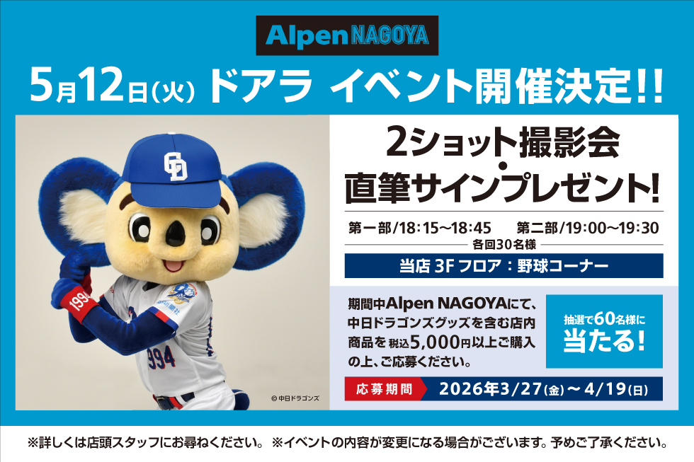 Alpen NAGOYAでお買い物された方、合計60名にドアラ2ショット撮影&直筆サインが当たる!