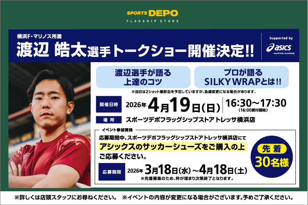アシックス契約選手の渡辺皓太選手(横浜F・マリノス)によるスペシャルイベントをスポーツデポ フラッグシップストア トレッサ横浜店で開催いたします。