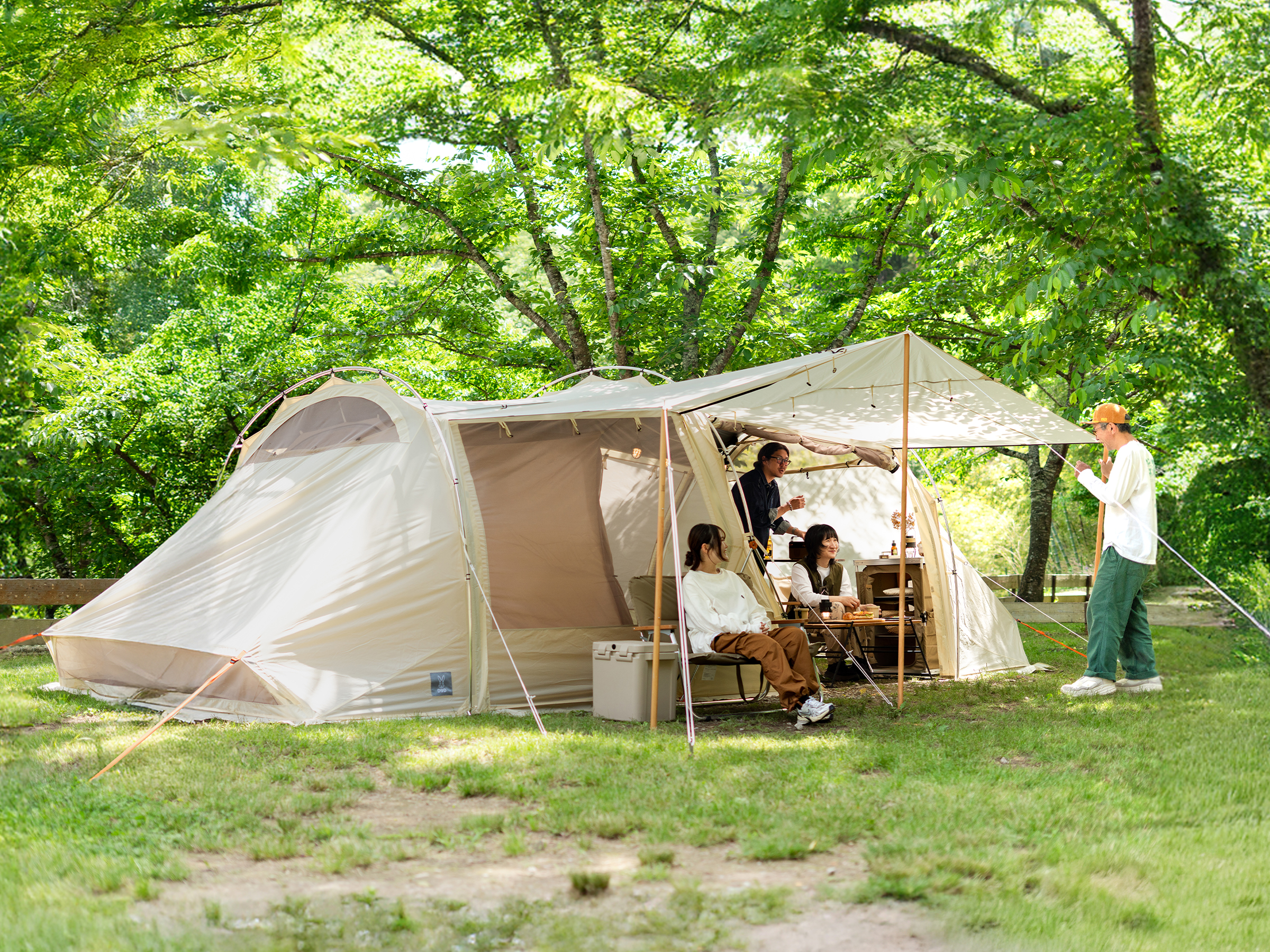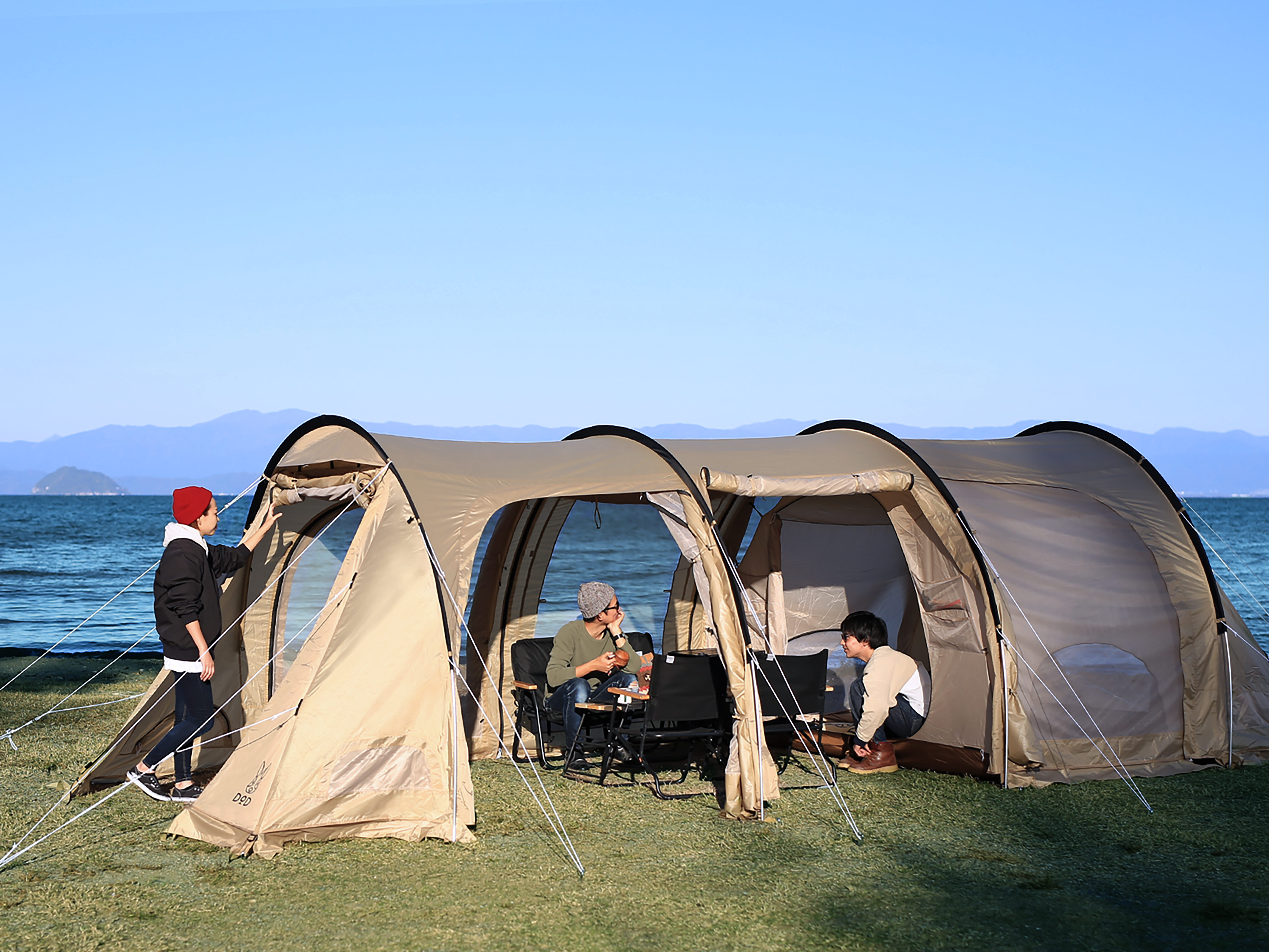広いリビングを備えた2ルーム型トンネルテント。カマボコテント史上最高の快適性と充実したオプションパーツで、よりワクワクするキャンプを。