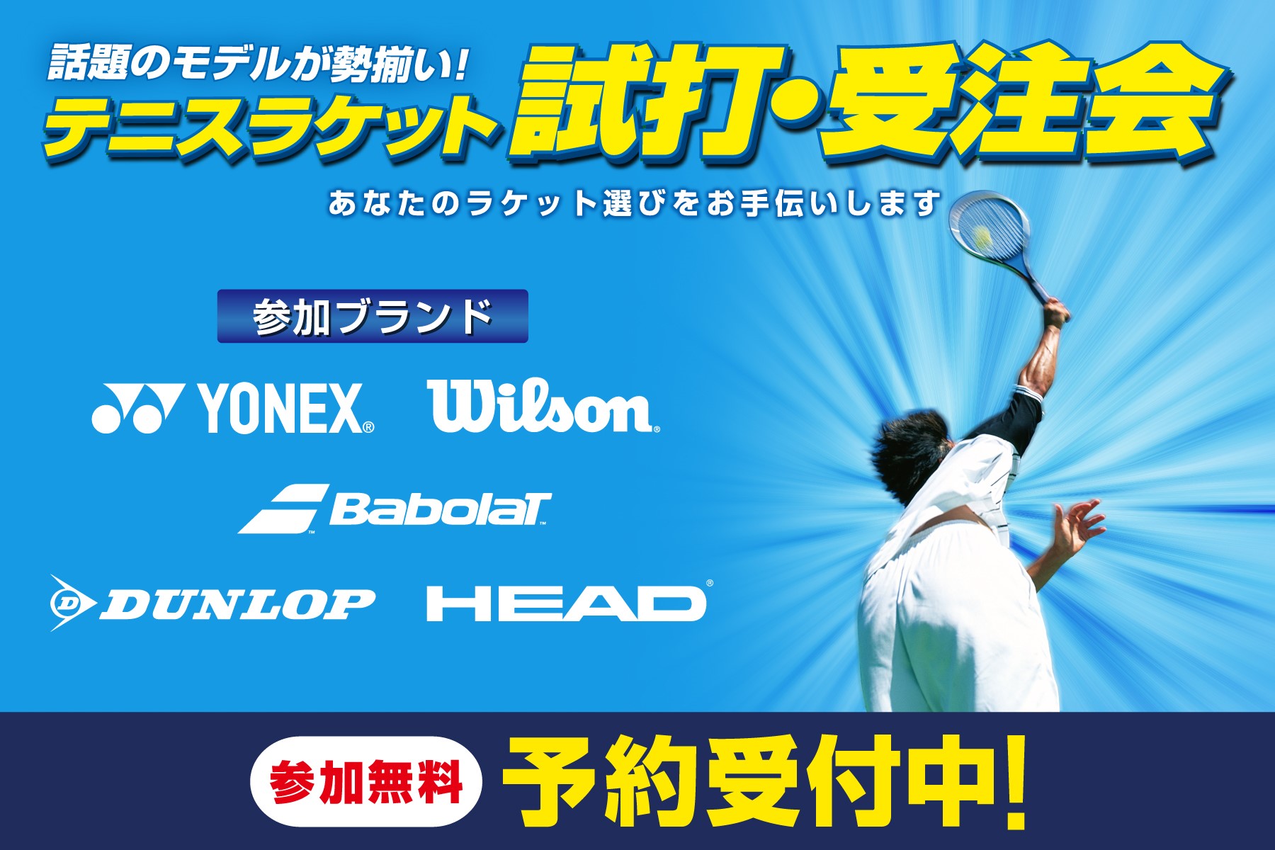 話題のNEWモデルラケットを試打・比較できる「テニス試打会」「バドミントン試打・試履会」「ミズノ バドミントン クリニック&試打・試履会」を全国で開催!人気ブランドのラケットを一度に比較することができます。当日は、このイベントだけの特別価格にてご注文いただけるほか、お見積り特典として「ストリング加工費 1回無料券」やご成約特典として「各メーカー ノベルティ」もプレゼント!参加者特典として3,000円以上で使える500円割引券もご用意しています。参加はもちろん無料!完全予約制でゆっくりご検討いただけます。たくさんのご予約お待ちしております!