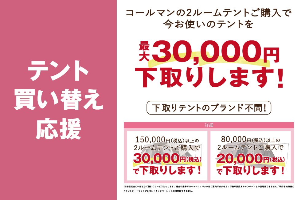 コールマンの2ルームテントご購入で、今お使いのテントを最大30,000円で下取りします。